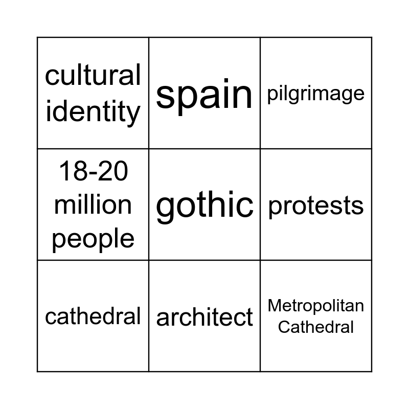 This bingo card has 13 words: Aztec, mayan, cathedral, spain, 18-20 million people, gothic, Metropolitan Cathedral, Basilica of Our Lady of Guadalupe, architect, cultural identity, protests, pilgrimage and religious devotion.