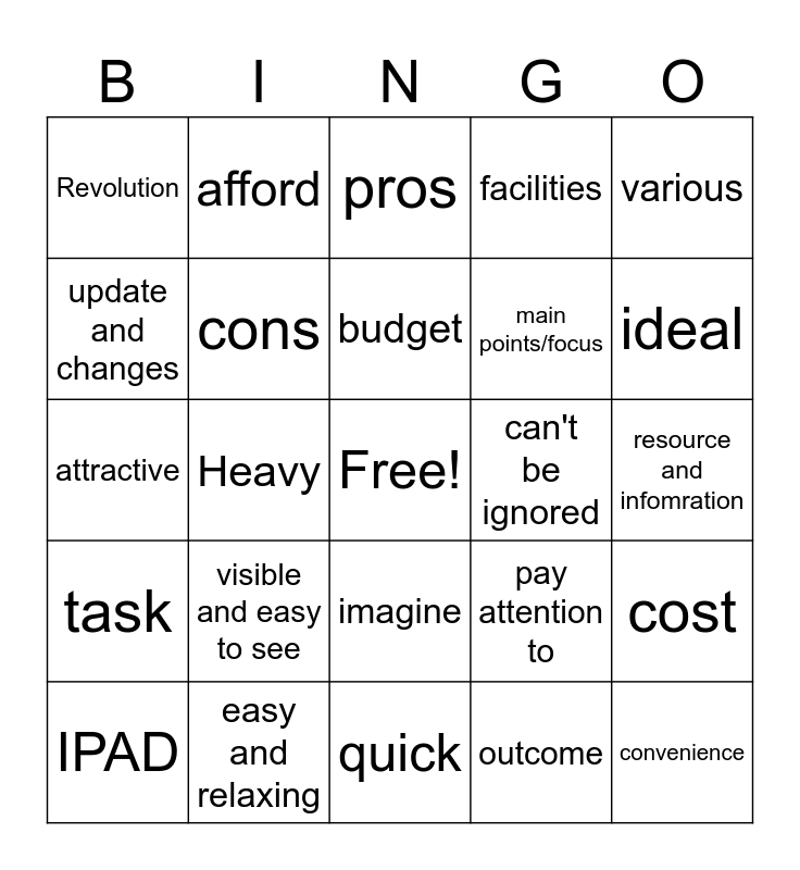 This bingo card has a free space and 29 words: IPAD, light, Heavy, Education, Revolution, pros, cons, visible and easy to see, can't be ignored, easy and relaxing, resource and infomration, convenience, quick, outcome, ideal, perfect, imagine, task, various, attractive, pay attention to, content, main points/focus, update and changes, facilities, afford, cost, budget and efficiency.