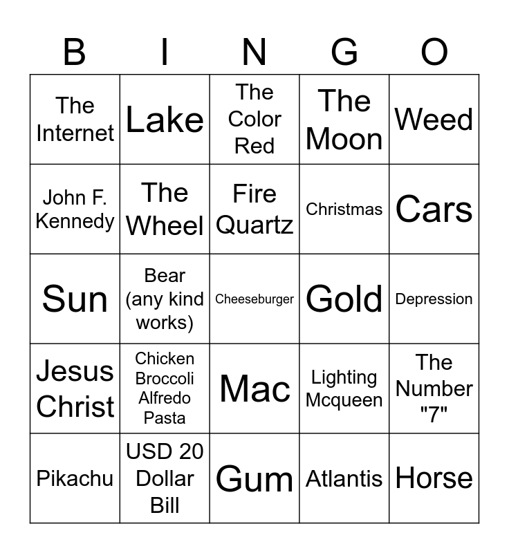 This bingo card has a free space and 30 words: The Empire State Building, USD 20 Dollar Bill, The Color Red, Wikipedia, Weed, The Internet, The Wheel, Fire Quartz, Christmas, Horse, Pikachu, Chicken Broccoli Alfredo Pasta, Atlantis, Minecraft, Jesus Christ, The Transistor, Gum, Gold, The Number "7", John F. Kennedy, Bear (any kind works), Lava Lamp, The Moon, Depression, Sun, Lake, Mac, Lighting Mcqueen, Cars and Ford.