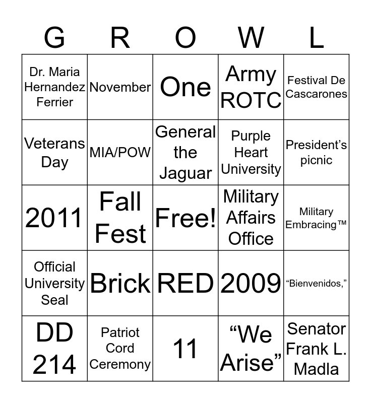 This bingo card has a free space and 42 words: Black, Silver, and Maroon, General the Jaguar, Ring Ceremony, Brick, “We Arise”, “Bienvenidos,”, Senator Frank L. Madla, 5, One, RED, Military Embracing™, President’s picnic, Fall Fest, Festival De Cascarones, Mr. and Mrs. A&M, 2009, 2010, 2011, 2014, November, Veterans Day, Memorial Day, Armed Forces Day, Dr. Maria Hernandez Ferrier, Centro De Artes, Healing Garden, Purple Heart University, Service Animal Relief Area, Welcome Week, JagX, JagTracks, Official University Seal, MIA/POW, 11, Qatar, DD 214, Patriot Cord Ceremony, Military Affairs Office, Military Community, Cemetery, Army ROTC and Jaguar March.