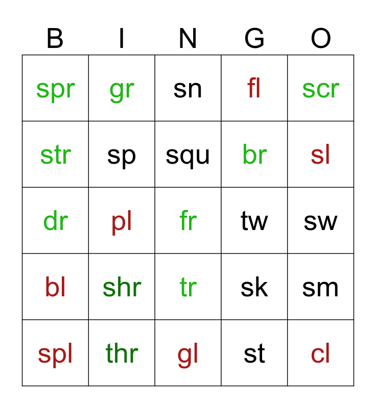 This bingo card has a free space and 24 words: shr, thr, squ, spl, scr, spr, str, gr, tw, tr, br, dr, sk, sm, sp, st, sw, sn, sl, pl, cl, bl, fl and gl.