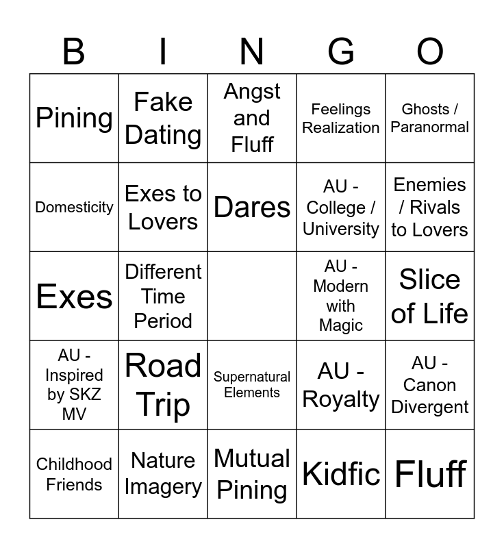 This bingo card has a free space and 74 words: 3+1 / 5+1 Times, Angst, Angst and Fluff, Animals / Pets, Arranged Marriage, Based on Other Media, Blind Date, Celestial Beings, Childhood Friends, Childhood Sweethearts, Confessions, Coworkers, Dares, Domesticity, Didn’t Know They Were Dating, Different Time Period, Dreams, Enemies / Rivals to Lovers, Established Relationship, Exes, Exes to Lovers, Fake Dating, Feelings Realization, Firsts, Fluff, Food / Cooking, Forbidden Love, Found Family, Friends With Benefits, Friends to Lovers, Ghosts / Paranormal, Handholding, Happy Ending, Hurt/Comfort, Idiots in Love, Kidfic, Magic, Marriage / Married Life / Weddings, Marriage of Convenience, Mistaken Identity, Mutual Pining, Nature Imagery, Neighbors, One Night Stands, Partners in Crime, Pining, Rivals with Benefits, Road Trip, Roommates, Secret Admirer, Sharing a Bed, Sickfic, Slice of Life, Slow Burn, Soulmates, Strangers to Lovers, Supernatural Elements, Time (Travel, Loops, etc.), Trapped Together, AU - Canon Divergent, AU - College / University, AU - Fantasy, AU - Inspired by SKZ MV, AU - Modern, AU - Modern with Magic, AU - Non-Idol Celebrity, AU - Reincarnation, AU - Rock Band, AU - Royalty, AU - Shops, AU - Small Town, AU - Space, AU - Spies / Secret Agents and AU - Vampires.