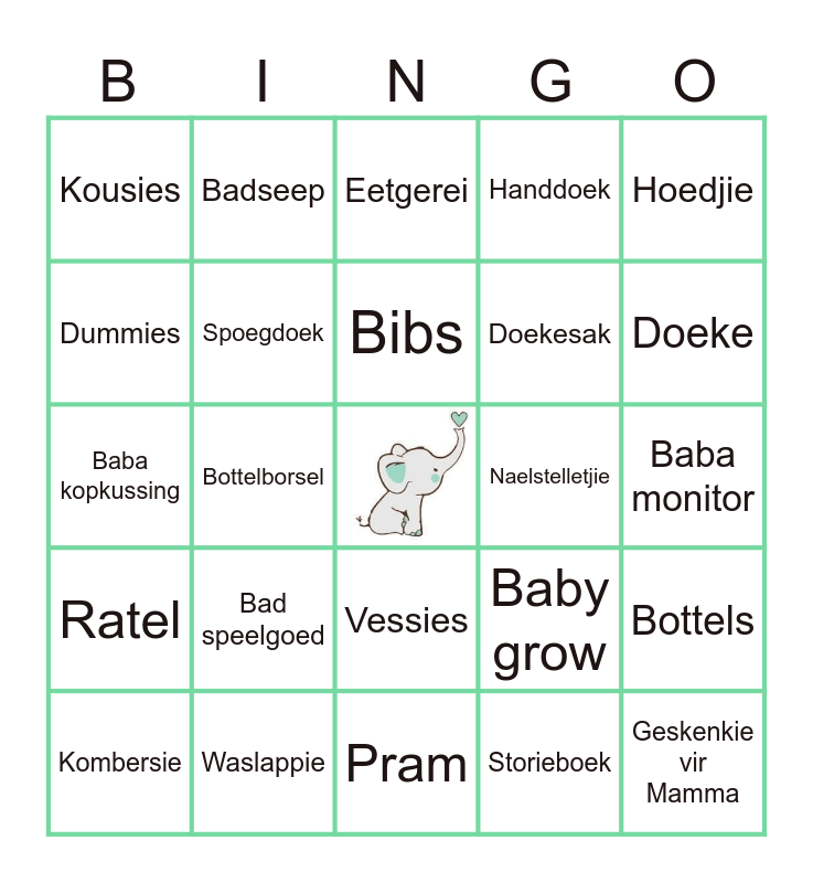 This bingo card has a free space and 24 words: Kombersie, Bad speelgoed, Bibs, Storieboek, Hoedjie, Kousies, Badseep, Eetgerei, Naelstelletjie, Baba monitor, Baba kopkussing, Spoegdoek, Baby grow, Bottels, Dummies, Waslappie, Pram, Handdoek, Doeke, Ratel, Bottelborsel, Vessies, Doekesak and Geskenkie vir Mamma.