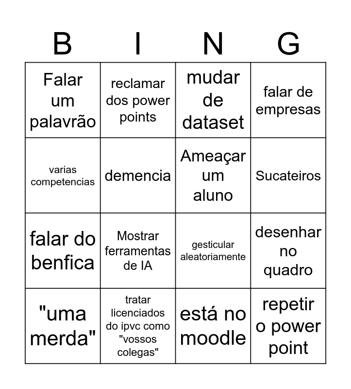 This bingo card has 27 words: tomei a liberdade, dito isto, falar do benfica, falar do porto, demencia, mudar de dataset, reclamar dos power points, repetir o power point, tratar licenciados do ipvc como "vossos colegas", piada seca, gesticular aleatoriamente, falar de empresas, mencionar 10 euros, "Vamos aguardar", Mostrar ferramentas de IA, Sentar e levantar logo de seguida, Ameaçar um aluno, Sucateiros, Falar dos "seus projetos", Falar um palavrão, está no moodle, falar da missa de domingo, desenhar no quadro, "uma merda", Prestem atenção, varias competencias and exclusividade do ipvc (ex:"não se dá isto no ipca").