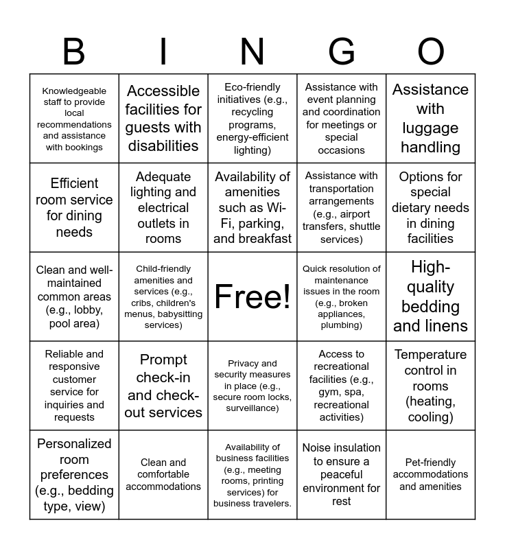 This bingo card has a free space and 24 words: Prompt check-in and check-out services, Clean and comfortable accommodations, Availability of amenities such as Wi-Fi, parking, and breakfast, Personalized room preferences (e.g., bedding type, view), Assistance with luggage handling, Knowledgeable staff to provide local recommendations and assistance with bookings, Efficient room service for dining needs, Accessible facilities for guests with disabilities, Quick resolution of maintenance issues in the room (e.g., broken appliances, plumbing), Privacy and security measures in place (e.g., secure room locks, surveillance), Assistance with transportation arrangements (e.g., airport transfers, shuttle services), Clean and well-maintained common areas (e.g., lobby, pool area), Access to recreational facilities (e.g., gym, spa, recreational activities), Temperature control in rooms (heating, cooling), Adequate lighting and electrical outlets in rooms, Noise insulation to ensure a peaceful environment for rest, High-quality bedding and linens, Eco-friendly initiatives (e.g., recycling programs, energy-efficient lighting), Options for special dietary needs in dining facilities, Child-friendly amenities and services (e.g., cribs, children's menus, babysitting services), Pet-friendly accommodations and amenities, Reliable and responsive customer service for inquiries and requests, Assistance with event planning and coordination for meetings or special occasions and Availability of business facilities (e.g., meeting rooms, printing services) for business travelers..