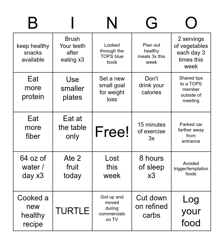 This bingo card has a free space and 24 words: Cooked a new healthy recipe, Ate 2 fruit today, Set a new small goal for weight loss, Cut down on refined carbs, 2 servings of vegetables each day 3 times this week, keep healthy snacks available, Brush Your teeth after eating x3, Looked through the TOPS blue book, 15 minutes of exercise 3x, Parked car farther away from entrance, Eat more fiber, Use smaller plates, 8 hours of sleep x3, Avoided trigger/temptation foods, Eat more protein, TURTLE, Got up and moved during commercials on TV, Plan out healthy meals 3x this week, Shared tips to a TOPS member outside of meeting, 64 oz of water / day x3, Eat at the table only, Lost this week, Don't drink your calories and Log your food.