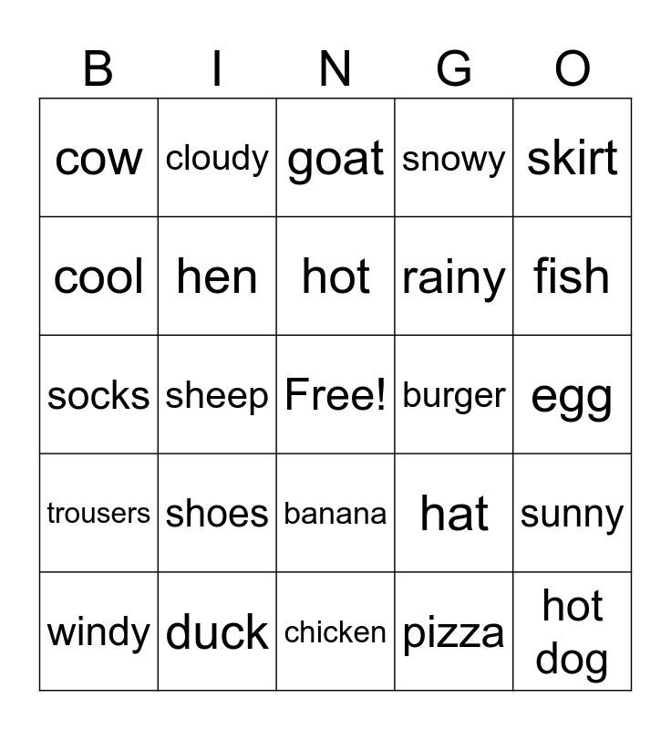 This bingo card has a free space and 30 words: duck, horse, sheep, turkey, cow, goat, hen, banana, burger, chicken, egg, hot dog, pizza, rice, fish, dress, hat, trousers, shoes, skirt, socks, wearing, cloudy, rainy, cool, snowy, sunny, windy, hot and cold.