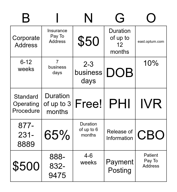 This bingo card has a free space and 24 words: 65%, 888-832-9475, 2-3 business days, $500, east.optum.com, Corporate Address, 6-12 weeks, Insurance Pay To Address, PHI, Duration of up to 6 months, DOB, Standard Operating Procedure, Release of Information, CBO, 7 business days, Payment Posting, IVR, $50, 10%, Duration of up to 3 months, Patient Pay To Address, 877-231-8889, Duration of up to 12 months and 4-6 weeks.