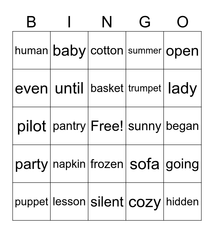 This bingo card has a free space and 24 words: napkin, lesson, basket, puppet, open, human, even, baby, sunny, frozen, trumpet, pilot, sofa, going, until, cozy, began, cotton, lady, pantry, hidden, party, summer and silent.