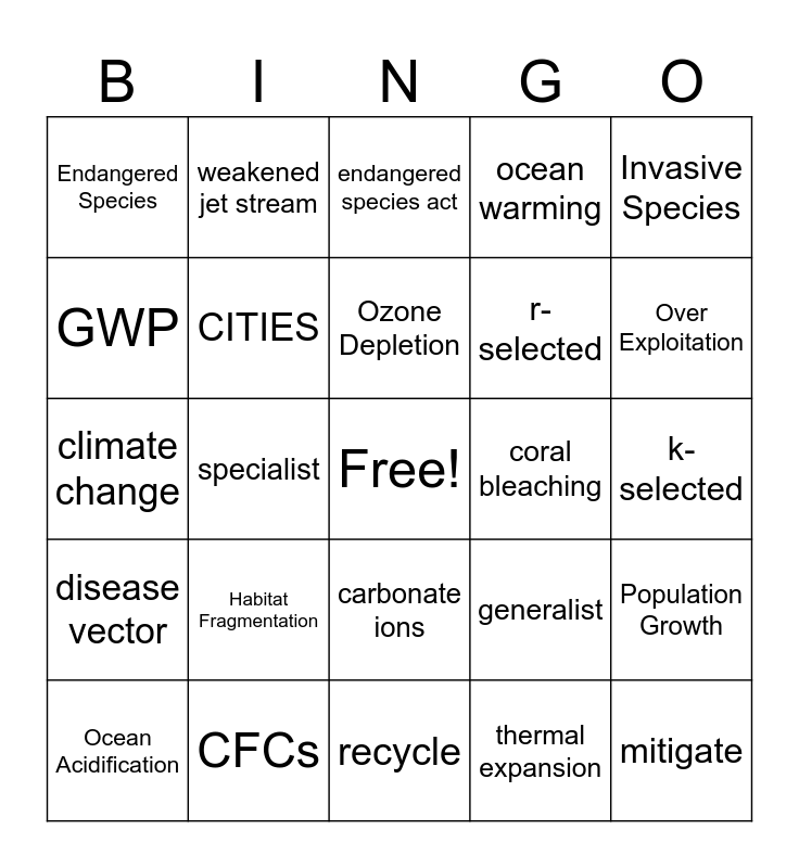 This bingo card has a free space and 24 words: Habitat Fragmentation, CFCs, Ozone Depletion, Ocean Acidification, Invasive Species, Endangered Species, GWP, weakened jet stream, coral bleaching, carbonate ions, r-selected, climate change, generalist, Population Growth, CITIES, thermal expansion, k-selected, endangered species act, Over Exploitation, specialist, mitigate, disease vector, ocean warming and recycle.