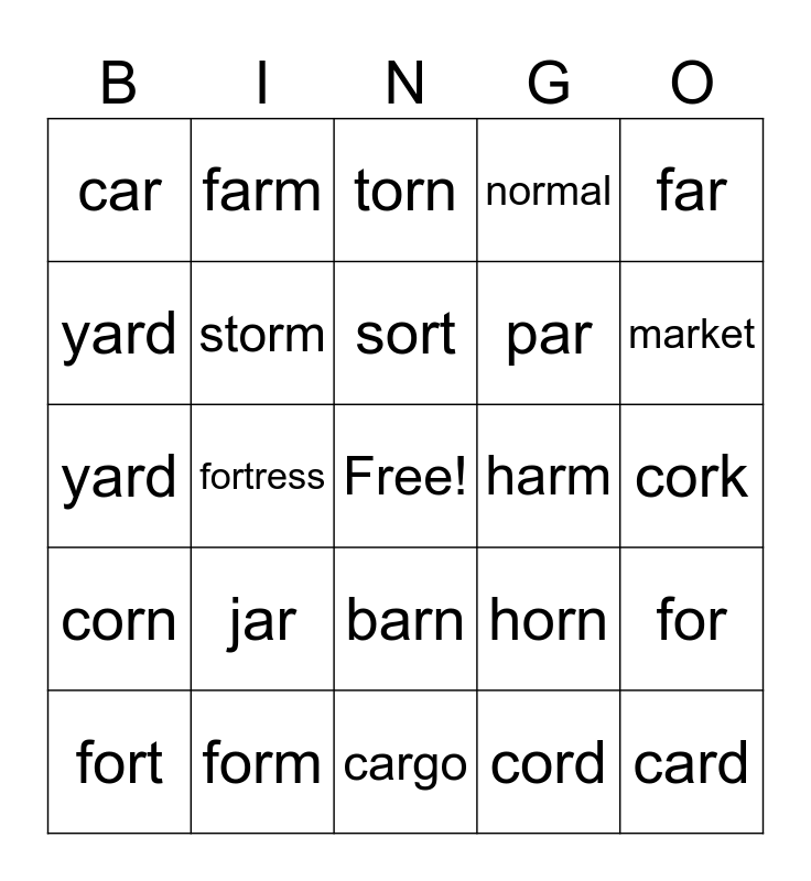 This bingo card has a free space and 24 words: jar, form, sort, fort, far, car, yard, farm, harm, barn, par, yard, horn, for, storm, cord, cork, torn, market, fortress, card, corn, normal and cargo.