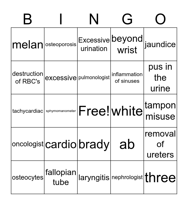 This bingo card has a free space and 35 words: megaly, itis, bone specialist, excessive, brady, beyond wrist, destruction of RBC's, nose bleed, pulmonologist, apnea, tachycardiac, jaundice, recording of the brain, ophthalmologist, melan, white, nephrologist, sphymomanometer, oncologist, three, ab, osteocytes, removal of ureters, fallopian tube, Excessive urination, pus in the urine, rhinitis, neuritis, inflammation of sinuses, tampon misuse, inflammation of windpipe, laryngitis, cardio, osteoporosis and Hepatitis.