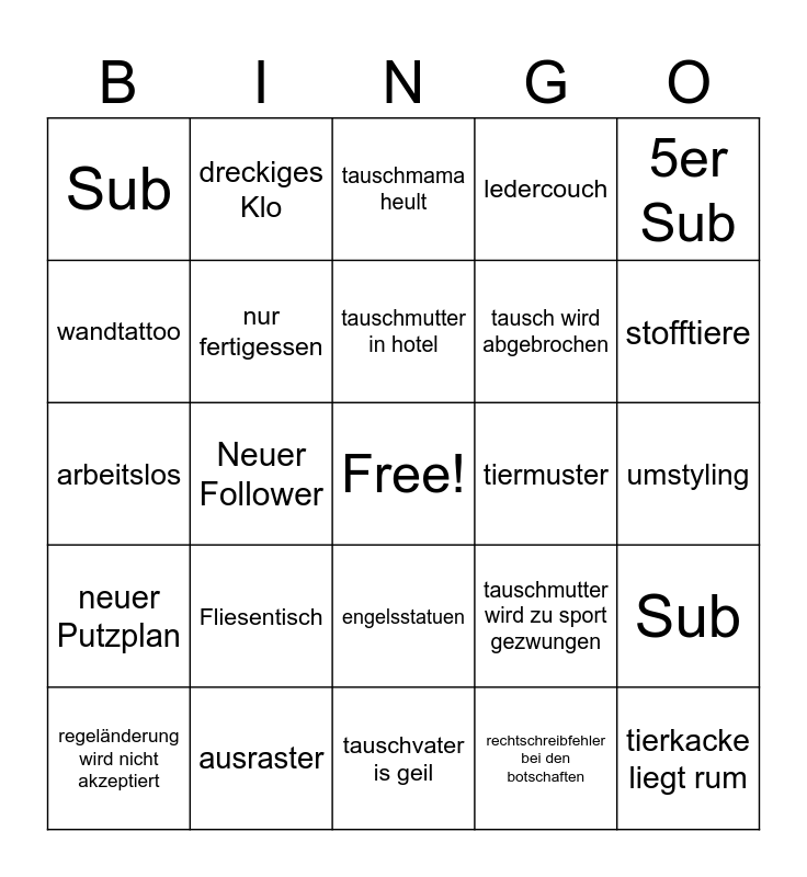 This bingo card has a free space and 24 words: Fliesentisch, ausraster, tauschmutter in hotel, regeländerung wird nicht akzeptiert, 5er Sub, Sub, wandtattoo, dreckiges Klo, tiermuster, engelsstatuen, tausch wird abgebrochen, arbeitslos, tauschmutter wird zu sport gezwungen, Sub, nur fertigessen, rechtschreibfehler bei den botschaften, umstyling, tauschmama heult, stofftiere, Neuer Follower, tierkacke liegt rum, neuer Putzplan, ledercouch and tauschvater is geil.