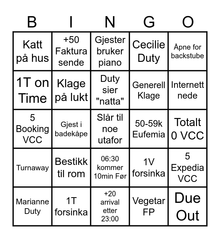 This bingo card has 25 words: Bestikk til rom, +20 arrival etter 23:00, Duty sier "natta", Marianne Duty, Åpne for backstube, Katt på hus, 1T on Time, +50 Faktura sende, 50-59k Eufemia, 06:30 kommer 10min Før, Generell Klage, 5 Booking VCC, 1V forsinka, 5 Expedia VCC, Klage på lukt, Due Out, Totalt 0 VCC, Gjester bruker piano, Internett nede, Gjest i badekåpe, Slår til noe utafor, 1T forsinka, Turnaway, Cecilie Duty and Vegetar FP.