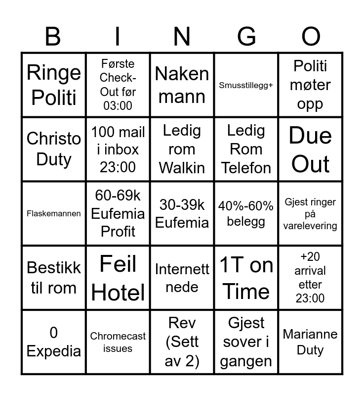 This bingo card has 25 words: Feil Hotel, Rev (Sett av 2), Ledig rom Walkin, 0 Expedia, Politi møter opp, Ringe Politi, Christo Duty, Første Check-Out før 03:00, 40%-60% belegg, Internett nede, Ledig Rom Telefon, Flaskemannen, 1T on Time, +20 arrival etter 23:00, 100 mail i inbox 23:00, Marianne Duty, Gjest ringer på varelevering, Naken mann, Due Out, 60-69k Eufemia Profit, 30-39k Eufemia, Chromecast issues, Bestikk til rom, Smusstillegg+ and Gjest sover i gangen.
