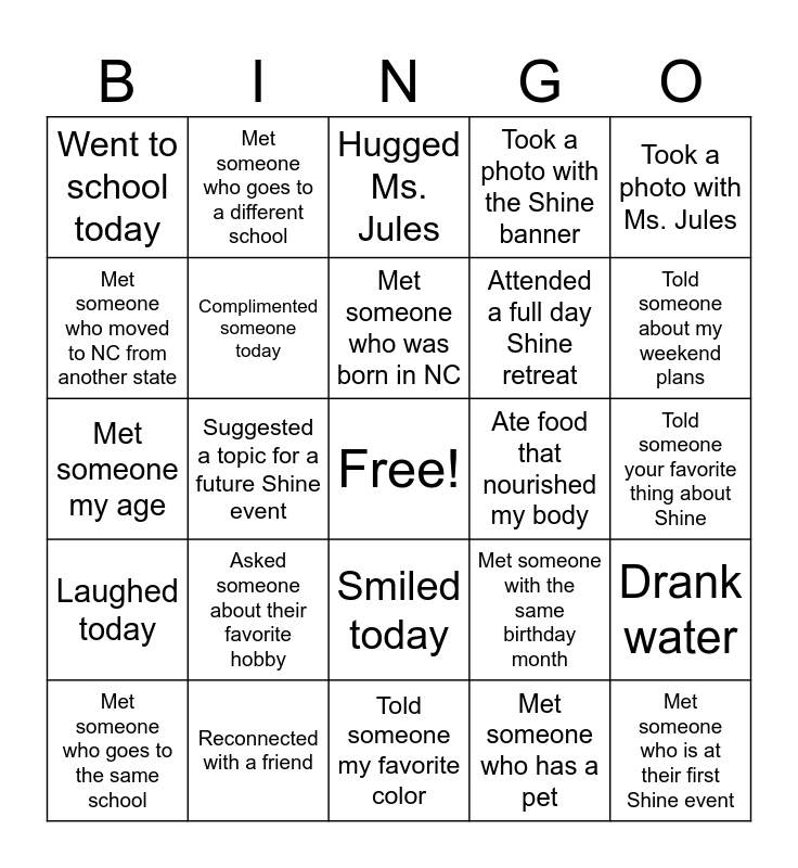 This bingo card has a free space and 24 words: Asked someone about their favorite hobby, Reconnected with a friend, Met someone who was born in NC, Met someone who goes to the same school, Took a photo with Ms. Jules, Went to school today, Met someone who moved to NC from another state, Met someone who goes to a different school, Ate food that nourished my body, Smiled today, Attended a full day Shine retreat, Met someone my age, Met someone with the same birthday month, Drank water, Complimented someone today, Met someone who has a pet, Told someone your favorite thing about Shine, Hugged Ms. Jules, Told someone about my weekend plans, Suggested a topic for a future Shine event, Met someone who is at their first Shine event, Laughed today, Took a photo with the Shine banner and Told someone my favorite color.