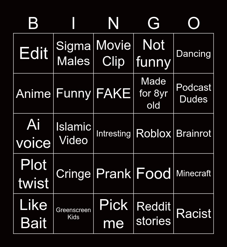 This bingo card has a free space and 24 words: Cringe, Greenscreen Kids, FAKE, Like Bait, Dancing, Edit, Anime, Sigma Males, Roblox, Prank, Made for 8yr old, Ai voice, Food, Minecraft, Funny, Reddit stories, Brainrot, Movie Clip, Podcast Dudes, Islamic Video, Racist, Plot twist, Not funny and Pick me.