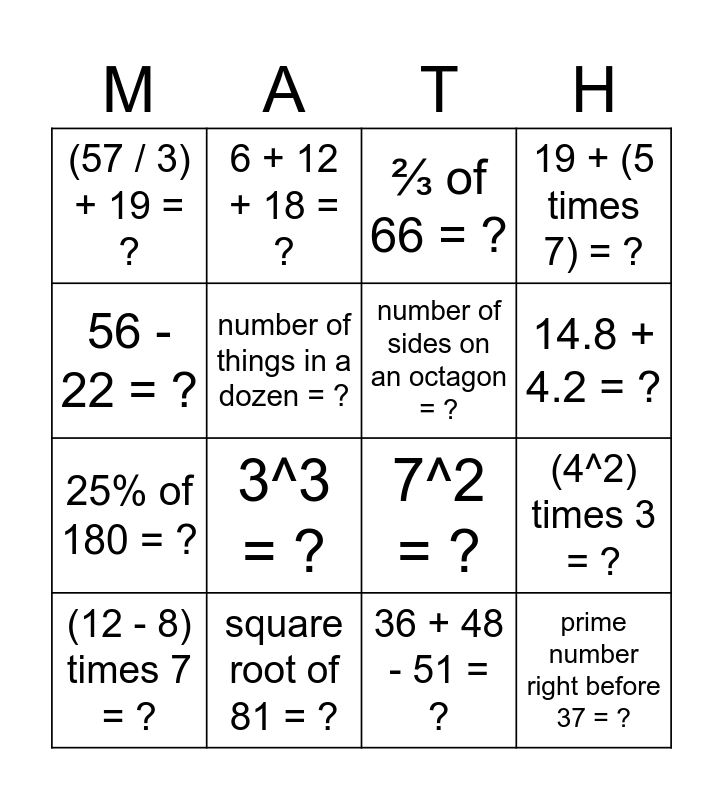 This bingo card has 40 words: 91 / 7 = ?, 7^2 = ?, 14 times 4 = ?, number of sides on an octagon = ?, 78 - 29 - 14 = ?, 50% of 150 = ?, 14.8 + 4.2 = ?, 12 times 7 = ?, 56 - 22 = ?, prime number right before 37 = ?, (4^2) times 3 = ?, 19 + (5 times 7) = ?, (12 - 8) times 7 = ?, 36 + 48 - 51 = ?, square root of 81 = ?, 100 - 39 = ?, 6 + 6 + 6 - 1 = ?, (57 / 3) + 19 = ?, 9^2 = ?, ⅔ of 66 = ?, 16 times 5 = ?, 15 times 6 = ?, 25% of 180 = ?, number of things in a dozen = ?, 15 + (3 times 8) = ?, 2 + 4 + 6 + 8 + 10 = ?, 56 - 37 + 48 = ?, 8^2 = ?, 63 - 26 = ?, ¾ of 32 = ?, 11 times 6 = ?, 1 + 3 + 5 + 7 + 9 = ?, 25% of 200 = ?, 4.3 + 6.7 = ?, 3^3 = ?, 8 times 5 = ?, next prime number after 23 = ?, ⅖ of 50 = ?, 6 + 12 + 18 = ? and 2^5 = ?.