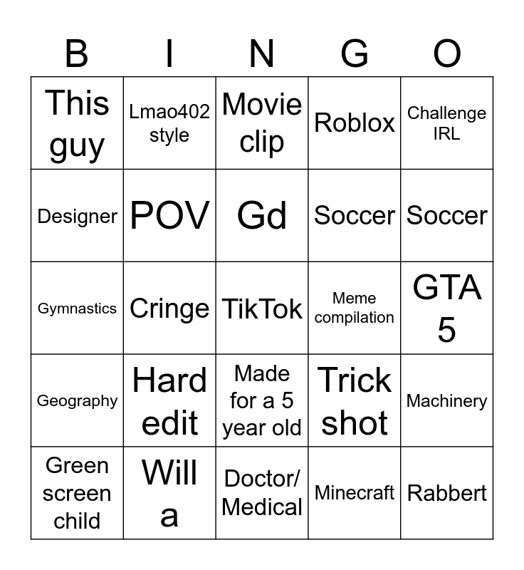 This bingo card has a free space and 24 words: Green screen child, Hard edit, Gd, Minecraft, Challenge IRL, This guy, Lmao402 style, Movie clip, Meme compilation, GTA 5, Gymnastics, POV, Trick shot, Machinery, Designer, Will a, Doctor/ Medical, Roblox, Soccer, Geography, Cringe, Made for a 5 year old, Soccer and Rabbert.