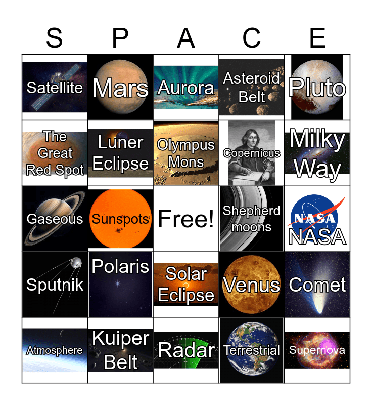 This bingo card has 27 images, a free space and 29 words: Atmosphere, 93 million, Sunspots, Solar Flare, Satellite, Aurora, Luner Eclipse, Polaris, Shepherd moons, Kuiper Belt, NASA, Supernova, Radar, Terrestrial, Milky Way, 186,000 miles/ second, Solar Eclipse, Sputnik, Pluto, Gaseous, Venus, Jupiter, Copernicus, The Great Red Spot, Asteroid Belt, Mars, Comet, Olympus Mons and Uranus.