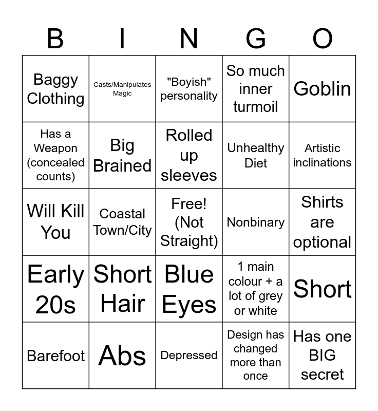 This bingo card has a free space and 24 words: Short Hair, Abs, Rolled up sleeves, Barefoot, Goblin, Baggy Clothing, Has a Weapon (concealed counts), Casts/Manipulates Magic, Nonbinary, Blue Eyes, Unhealthy Diet, Will Kill You, 1 main colour + a lot of grey or white, Short, Big Brained, Design has changed more than once, Shirts are optional, "Boyish" personality, Artistic inclinations, Coastal Town/City, Has one BIG secret, Early 20s, So much inner turmoil and Depressed.