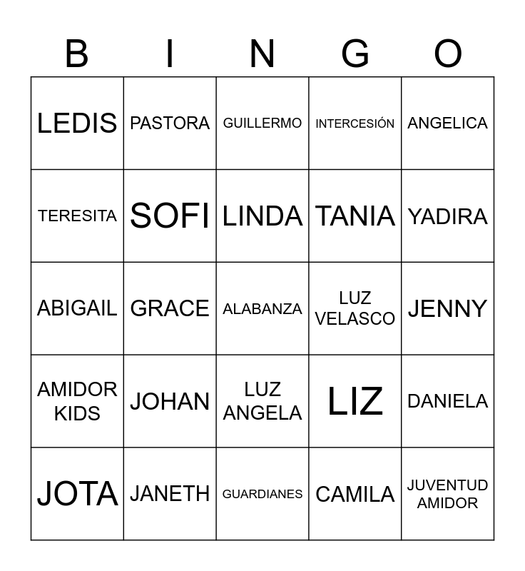 This bingo card has a free space and 24 words: JOHAN, JANETH, LINDA, JOTA, ANGELICA, LEDIS, TERESITA, PASTORA, LUZ VELASCO, LUZ ANGELA, TANIA, ABIGAIL, LIZ, DANIELA, SOFI, CAMILA, JENNY, GUILLERMO, YADIRA, GRACE, JUVENTUD AMIDOR, AMIDOR KIDS, INTERCESIÓN and GUARDIANES.