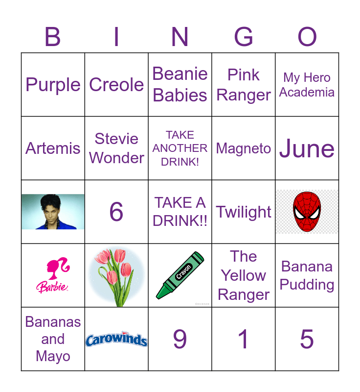 This bingo card has 8 images, a free space and 21 words: Bananas and Mayo, 6, Purple, Beanie Babies, Stevie Wonder, Twilight, 5, 9, 1, June, New Lex Luther, My Hero Academia, The Yellow Ranger, Las Vegas, Magneto, Artemis, Pink Ranger, Creole, Banana Pudding, TAKE ANOTHER DRINK! and SING A SONG!!.
