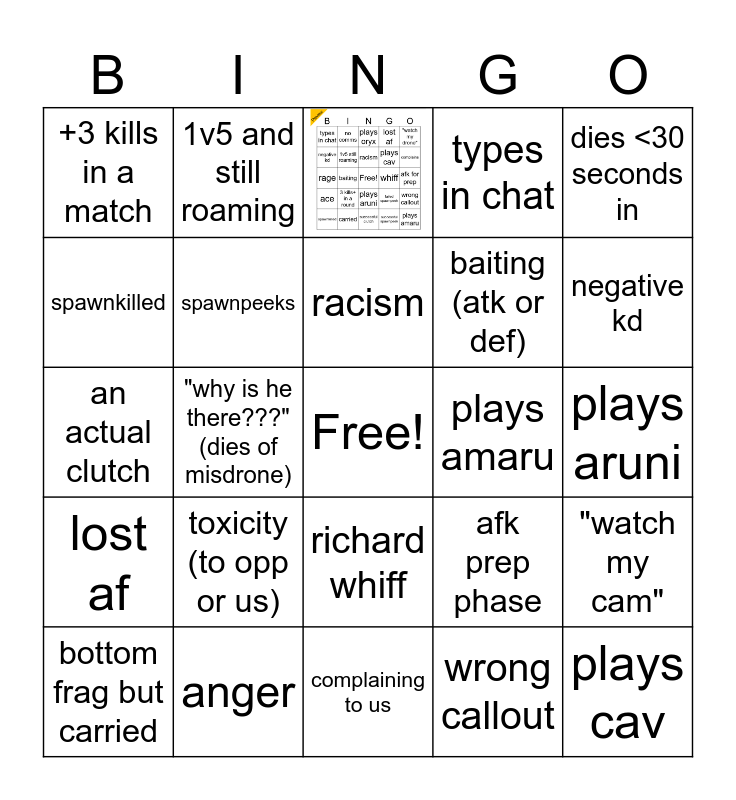 This bingo card has 1 images, a free space and 23 words: toxicity (to opp or us), anger, racism, bottom frag but carried, dies <30 seconds in, +3 kills in a match, spawnkilled, 1v5 and still roaming, plays amaru, richard whiff, baiting (atk or def), an actual clutch, afk prep phase, "watch my cam", spawnpeeks, wrong callout, plays aruni, negative kd, "why is he there???" (dies of misdrone), plays cav, lost af, types in chat and complaining to us.