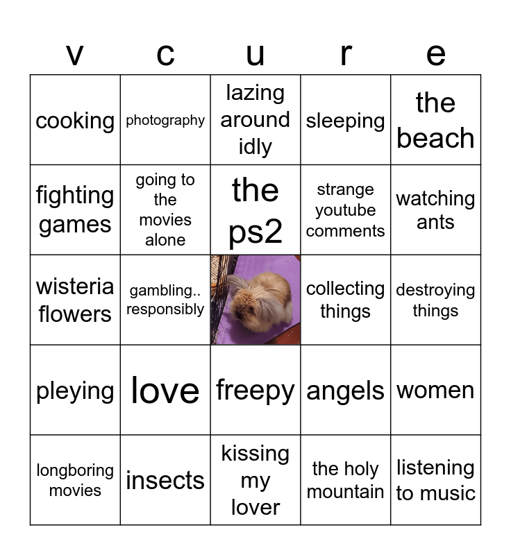 This bingo card has a free space and 24 words: love, insects, the ps2, longboring movies, the beach, cooking, fighting games, photography, collecting things, freepy, strange youtube comments, wisteria flowers, angels, women, going to the movies alone, the holy mountain, destroying things, lazing around idly, watching ants, gambling.. responsibly, listening to music, pleying, sleeping and kissing my lover.