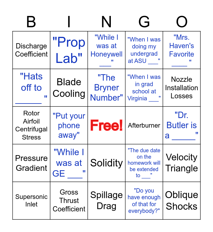 This bingo card has a free space and 24 words: "While I was at GE ___", Gross Thrust Coefficient, "The Bryner Number", Supersonic Inlet, "Mrs. Haven's Favorite ____ ", Discharge Coefficient, "Hats off to _____ ", "Prop Lab", Afterburner, Solidity, "When I was in grad school at Virginia ___", Rotor Airfoil Centrifugal Stress, "The due date on the homework will be extended to ___", Velocity Triangle, Blade Cooling, "Do you have enough of that for everybody?", "Dr. Butler is a _____", "While I was at Honeywell ___", Nozzle Installation Losses, "Put your phone away", Oblique Shocks, Pressure Gradient, "When I was doing my undergrad at ASU ___" and Spillage Drag.