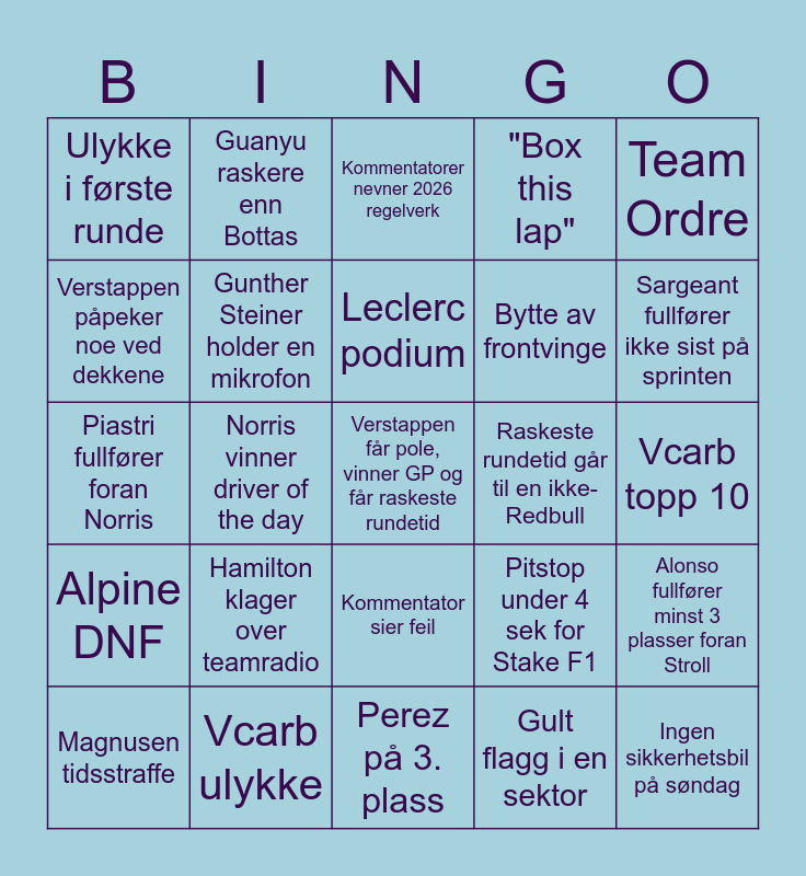 This bingo card has a free space and 24 words: Hamilton klager over teamradio, Vcarb ulykke, Leclerc podium, Magnusen tidsstraffe, Team Ordre, Ulykke i første runde, Verstappen påpeker noe ved dekkene, Guanyu raskere enn Bottas, Raskeste rundetid går til en ikke-Redbull, Kommentator sier feil, Bytte av frontvinge, Piastri fullfører foran Norris, Pitstop under 4 sek for Stake F1, Alonso fullfører minst 3 plasser foran Stroll, Gunther Steiner holder en mikrofon, Gult flagg i en sektor, Vcarb topp 10, Kommentatorer nevner 2026 regelverk, Sargeant fullfører ikke sist på sprinten, Norris vinner driver of the day, Ingen sikkerhetsbil på søndag, Alpine DNF, "Box this lap" and Perez på 3. plass.