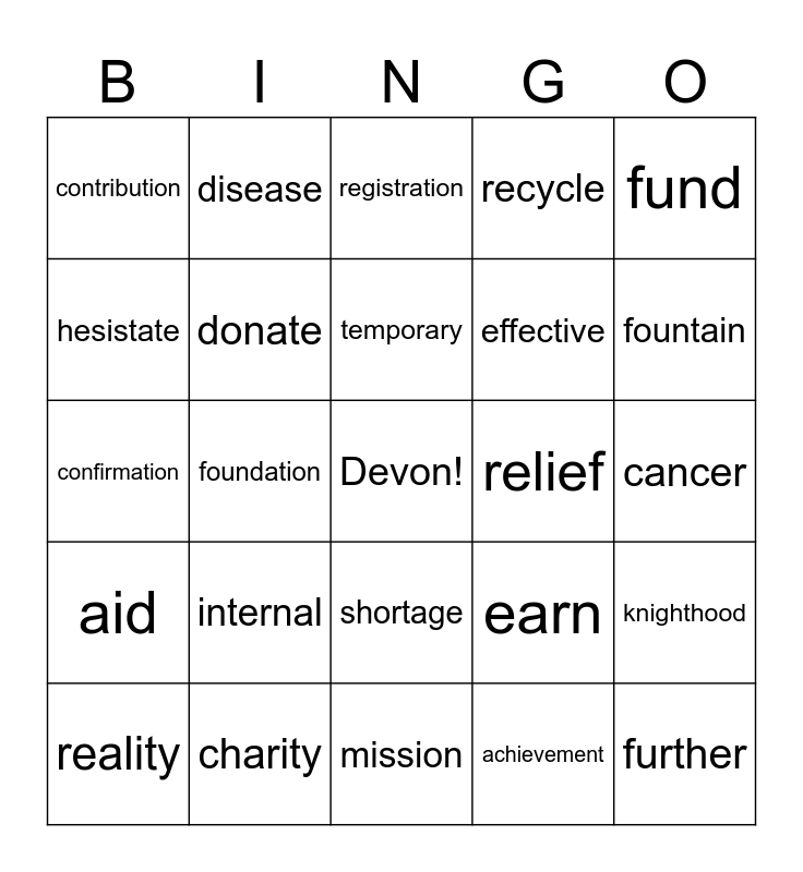 This bingo card has a free space and 24 words: internal, charity, temporary, reality, fund, contribution, hesistate, disease, relief, shortage, effective, confirmation, earn, knighthood, donate, achievement, cancer, registration, fountain, foundation, further, aid, recycle and mission.