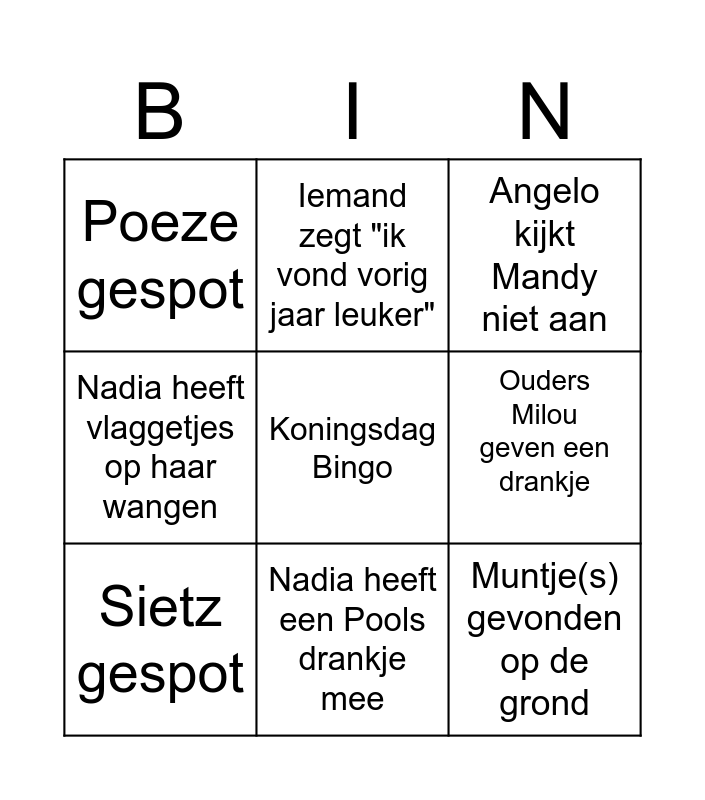 This bingo card has a free space and 8 words: Ouders Milou geven een drankje, Angelo kijkt Mandy niet aan, Iemand zegt "ik vond vorig jaar leuker", Sietz gespot, Poeze gespot, Muntje(s) gevonden op de grond, Nadia heeft vlaggetjes op haar wangen and Nadia heeft een Pools drankje mee.