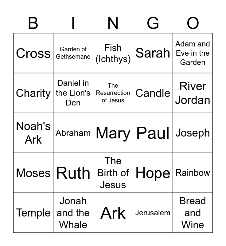 This bingo card has 41 words: Free!, Noah's Ark, David and Goliath, Daniel in the Lion's Den, Jonah and the Whale, The Birth of Jesus, The Resurrection of Jesus, Moses Parts the Red Sea, Adam and Eve in the Garden, Moses, Abraham, Sarah, Mary, Joseph, Paul, Ruth, Esther, Cross, Dove, Fish (Ichthys), Rainbow, Bread and Wine, Ark, Candle, Palm Branch, Bethlehem, Jerusalem, Nazareth, River Jordan, Sea of Galilee, Mount Sinai, Garden of Gethsemane, Temple, Faith, Hope, Charity, Forgiveness, Love, Patience, Kindness and Peace.