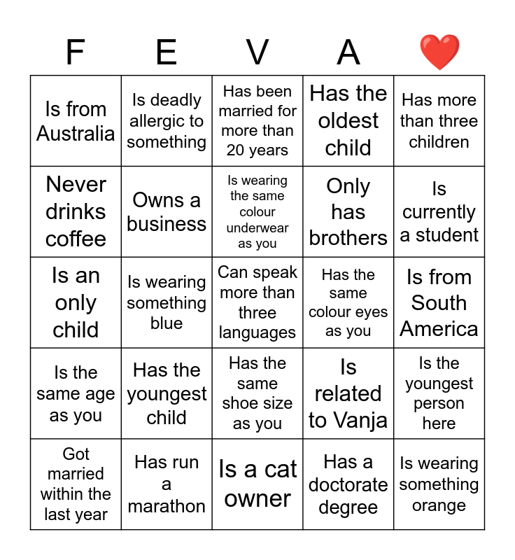 This bingo card has 43 words: Can play a musical instrument, Can speak more than three languages, Drinks coffee every single day, Got married within the last year, Had the shortest route to get here., Has a doctorate degree, Has been married for more than 20 years, Has known either bride for more than 10 years, Has more than three children, Has run a marathon, Has the oldest child, Has the same colour eyes as you, Has the same shoe size as you, Has the youngest child, Has travelled to more than 20 countries, Is a cat owner, Is a dog owner, Is an only child, Is born in the same month as you, Is currently a student, Is deadly allergic to something, Is engaged, Is from Asia, Is from Australia, Is from Europe, Is from South America, Is left handed, Is related to Felice, Is related to Vanja, Is the same age as you, Is the same age as you, Is the youngest person here, Is wearing contact lenses, Is wearing something blue, Is wearing something borrowed, Is wearing something old, Is wearing something orange, Is wearing the same colour underwear as you, Never drinks coffee, Only has brothers, Only has sisters, Owns a business and Went to school with either bride.