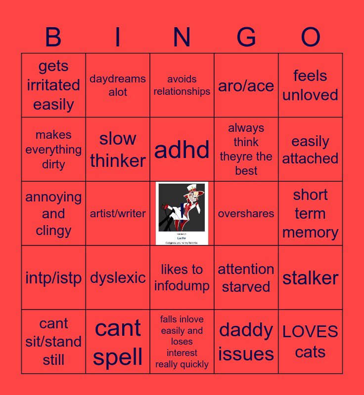 This bingo card has a free space and 24 words: dyslexic, cant spell, adhd, cant sit/stand still, feels unloved, gets irritated easily, makes everything dirty, daydreams alot, overshares, likes to infodump, always think theyre the best, annoying and clingy, attention starved, stalker, slow thinker, daddy issues, short term memory, avoids relationships, easily attached, artist/writer, LOVES cats, intp/istp, aro/ace and falls inlove easily and loses interest really quickly.
