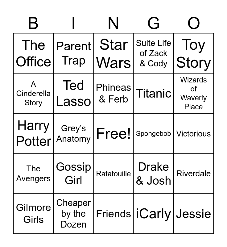 This bingo card has a free space and 31 words: Friends, Stranger Things, Grey’s Anatomy, Young Sheldon, The Office, Star Wars, Ted Lasso, Drake & Josh, Spongebob, iCarly, Victorious, Jessie, Good Luck Charlie, Shake It Up, Wizards of Waverly Place, Hannah Montana, Riverdale, Gossip Girl, The Avengers, Ratatouille, Toy Story, Frozen, Gilmore Girls, Parent Trap, Titanic, A Cinderella Story, Suite Life of Zack & Cody, Harry Potter, Cheaper by the Dozen, Phineas & Ferb and Full House.