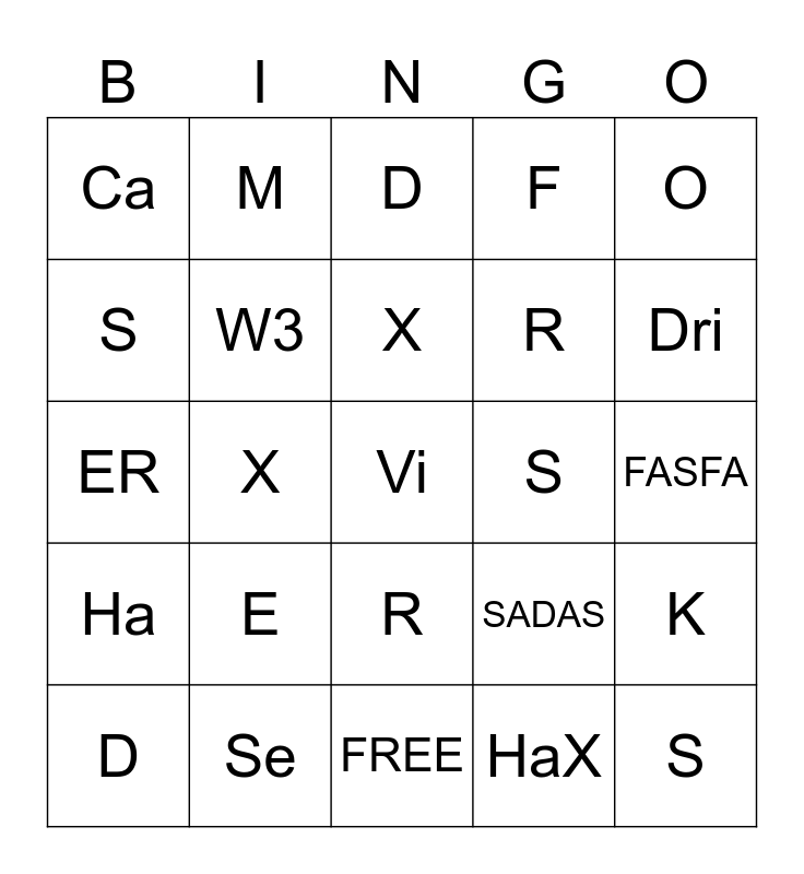 This bingo card has 25 words: Ha, Se, Vi, HaX, O, Ca, M, D, S, K, S, W3, FREE, SADAS, Dri, D, X, X, R, FASFA, ER, E, R, F and S.