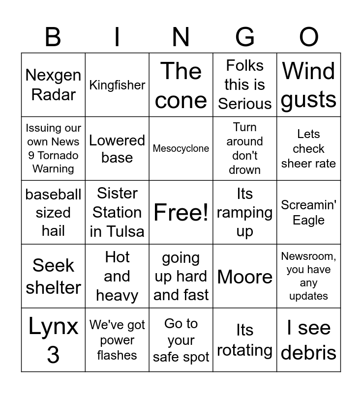 This bingo card has a free space and 29 words: Lynx 3, I-35 Corridor, Sister Station in Tulsa, Lets get an update from Val, Nexgen Radar, The cone, Lowered base, Hot and heavy, Its ramping up, We've got power flashes, Screamin' Eagle, I see debris, Go to your safe spot, Its rotating, Lets check sheer rate, Tell "stormchaser" to get south!, going up hard and fast, Seek shelter, Wind gusts, baseball sized hail, Moore, Bob Mills Skynews 9, Turn around don't drown, Issuing our own News 9 Tornado Warning, Folks this is Serious, Kingfisher, Newsroom, you have any updates, Mesocyclone and Check out that hook.