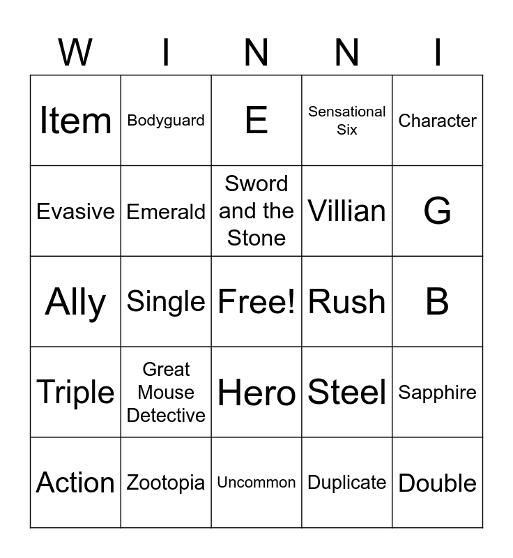 This bingo card has a free space and 24 words: Great Mouse Detective, Zootopia, Sword and the Stone, Action, Character, Item, Evasive, Bodyguard, Rush, Hero, Villian, Ally, Steel, Sapphire, Emerald, Duplicate, B, E, G, Single, Double, Triple, Sensational Six and Uncommon.