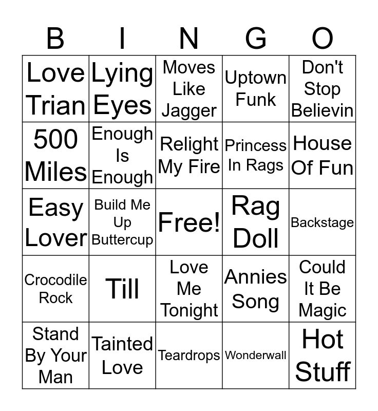 This bingo card has a free space and 45 words: Human, Hot Stuff, Native New Yorker, Stand By Your Man, Angels, Wonderwall, Moves Like Jagger, I Gotta Feeling, Don't Stop Believin, Tainted Love, Uptown Funk, Rag Doll, Love Me Tonight, Till, Shoe Shine Boy, Teardrops, The Boxer, Easy Lover, The Gambler, House Of Fun, Lying Eyes, Ring Of Fire, Hold Me Close, Love Trian, Mexican Girl, Backstage, Rock The Boat, The Wonder Of You, Annies Song, Crocodile Rock, Baby Jane, Could It Be Magic, Spirit In The Sky, Chain Reaction, Yes Sir I Can Boogie, Build Me Up Buttercup, Rocking All Over The World, The Loco Motion, Young Hearts Run Free, Relight My Fire, 500 Miles, Princess In Rags, Friends In Low Places, Enough Is Enough and Rock Dj.