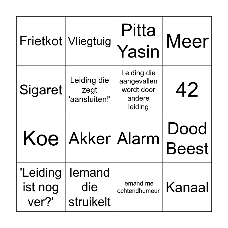 This bingo card has 28 words: Vlag, Graftsteen van uit de jaren 80, Koe, Boot, Leiding die zegt 'aansluiten!', Pitta Yasin, Vliegtuig, Kanaal, Iemand die struikelt, Kat, Alarm, Meer, Rode Auto, Arne hoort iets niet, Akker, Leiding die eet, Leiding die danst, Leiding die aangevallen wordt door andere leiding, 42, iemand die frans spreekt, Frietkot, Vrachtwagen toetert, 'Leiding ist nog ver?', Dood Beest, iemand me ochtendhumeur, Tractor, Sigaret and Band.