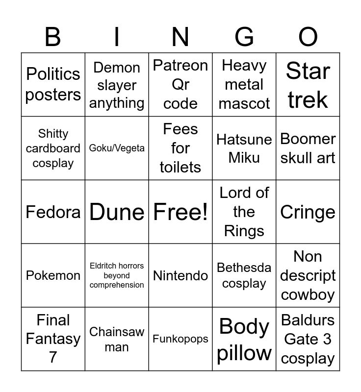 This bingo card has a free space and 49 words: Furries, Baldurs Gate 3 cosplay, Marvels cosplay, Funkopops, Eldritch horrors beyond comprehension, Disney princess, Demon slayer anything, Anything referencing wizard of oz, Shitty cardboard cosplay, Really good cosplay, Goku/Vegeta, Heavy metal mascot, Non descript cowboy, Bethesda cosplay, Cthulhu plushie, Local corporate sponsor, Fees for toilets, Lord of the Rings, Star Wars, Star trek, Dune, Body pillow, Politics posters, Hatsune Miku, Harry Potter, Boomer skull art, Final Fantasy 7, Helldivers, Nintendo, Pokemon, Novelty soap, Doom, Undertale, Halo, Chainsaw man, Free food samples, Hand crafted goods, Art drawn live, Cringe, That smell, Deep Rock Galactic, Classic Arcade Cabinet, Mortal Combat, Sonic the Hedgehog, Fedora, Patreon Qr code, Wojak meme, Early 2000s memes and Rage comics.