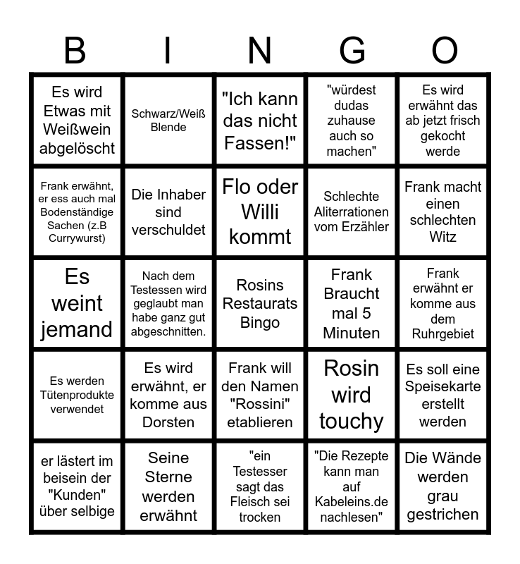 This bingo card has a free space and 24 words: Es wird erwähnt, er komme aus Dorsten, Seine Sterne werden erwähnt, Flo oder Willi kommt, er lästert im beisein der "Kunden" über selbige, Es wird erwähnt das ab jetzt frisch gekocht werde, Es wird Etwas mit Weißwein abgelöscht, Frank erwähnt, er ess auch mal Bodenständige Sachen (z.B Currywurst), Schwarz/Weiß Blende, Frank Braucht mal 5 Minuten, Frank will den Namen "Rossini" etablieren, Schlechte Aliterrationen vom Erzähler, Es weint jemand, Rosin wird touchy, Es soll eine Speisekarte erstellt werden, Die Inhaber sind verschuldet, "Die Rezepte kann man auf Kabeleins.de nachlesen", Frank erwähnt er komme aus dem Ruhrgebiet, "Ich kann das nicht Fassen!", Frank macht einen schlechten Witz, Nach dem Testessen wird geglaubt man habe ganz gut abgeschnitten., Die Wände werden grau gestrichen, Es werden Tütenprodukte verwendet, "würdest dudas zuhause auch so machen" and "ein Testesser sagt das Fleisch sei trocken.
