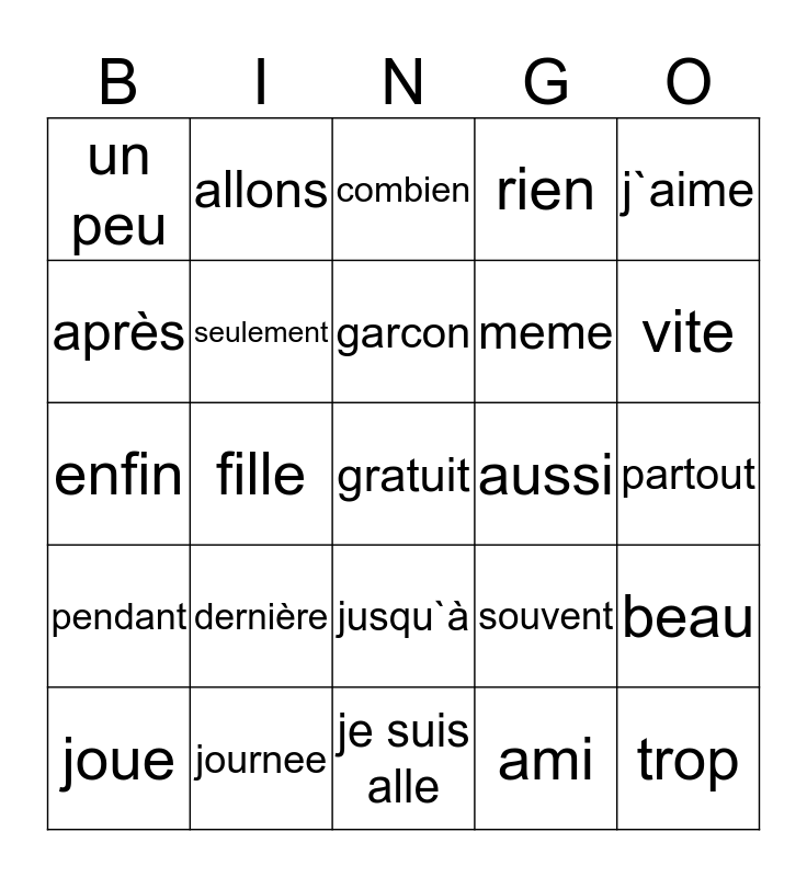 This bingo card has a free space and 24 words: dernière, journee, garcon, joue, j`aime, un peu, après, allons, aussi, jusqu`à, meme, enfin, souvent, beau, seulement, ami, partout, combien, vite, fille, trop, pendant, rien and je suis alle.