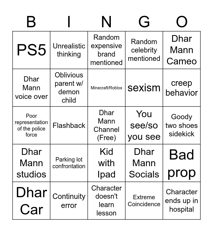 This bingo card has a free space and 29 words: Dhar Car, Merch, Flashback, Spaghetti, PS5, Random expensive brand mentioned, Oblivious parent w/ demon child, Parking lot confrontation, You see/so you see, Continuity error, Goody two shoes sidekick, Character ends up in hospital, Character doesn't learn lesson, Extreme Coincidence, creep behavior, Crazy mom w/ chill dad, Kid with Ipad, Dhar Mann studios, Dhar Mann Cameo, Poor representation of the police force, Dhar Mann Socials, Time skip, sexism, Dhar Mann voice over, Random celebrity mentioned, Unrealistic thinking, Bad prop, Minecraft/Roblox and Unrealistic event.