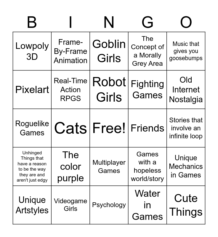 This bingo card has a free space and 24 words: The color purple, Videogame Girls, Robot Girls, Unique Artstyles, Music that gives you goosebumps, Lowpoly 3D, Pixelart, Frame-By-Frame Animation, Friends, Multiplayer Games, Fighting Games, Roguelike Games, Games with a hopeless world/story, Unique Mechanics in Games, Real-Time Action RPGS, Water in Games, Stories that involve an infinite loop, Goblin Girls, Old Internet Nostalgia, Cats, Cute Things, Unhinged Things that have a reason to be the way they are and aren't just edgy, The Concept of a Morally Grey Area and Psychology.