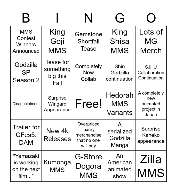 This bingo card has a free space and 24 words: New 4k Releases, Kumonga MMS, Completely New Collab, "Yamazaki is working on the next film...", Lots of MG Merch, MMS Contest Winners Announced, Godzilla SP Season 2, King Goji MMS, Hedorah MMS Variants, Overpriced luxury merchandise that no one will buy, Shin Godzilla continuation, Disappointment, A serialized Godzilla Manga, Surprise Kaneko appearance, Tease for something big this Fall, An American animated show, A completely new animated project in Japan, Gemstone Shortfall Tease, SJHU Collaboration Continuation, Surprise Wingard Appearance, Zilla MMS, Trailer for GFes5: DAM, King Shisa MMS and G-Store Dogora MMS.