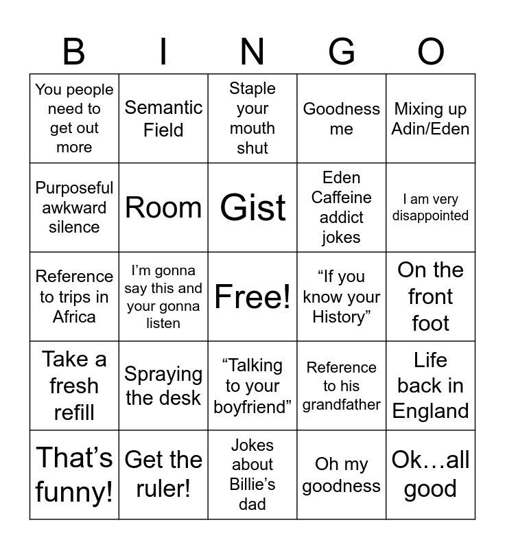 This bingo card has a free space and 25 words: Spraying the desk, Jokes about Billie’s dad, Gist, That’s funny!, Mixing up Adin/Eden, You people need to get out more, Purposeful awkward silence, Semantic Field, “If you know your History”, “Talking to your boyfriend”, Eden Caffeine addict jokes, Reference to trips in Africa, Reference to his grandfather, Life back in England, Room, Appreciation, On the front foot, Staple your mouth shut, I am very disappointed, I’m gonna say this and your gonna listen, Ok…all good, Get the ruler!, Take a fresh refill, Goodness me and Oh my goodness.