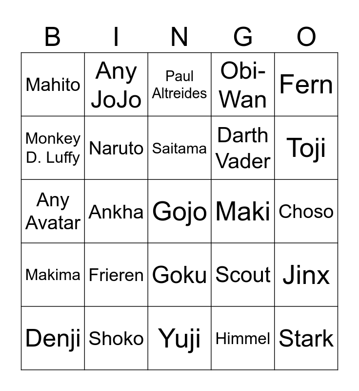 This bingo card has a free space and 24 words: Frieren, Shoko, Saitama, Denji, Fern, Mahito, Monkey D. Luffy, Any JoJo, Maki, Goku, Darth Vader, Any Avatar, Scout, Jinx, Naruto, Himmel, Choso, Paul Altreides, Toji, Ankha, Stark, Makima, Obi-Wan and Yuji.